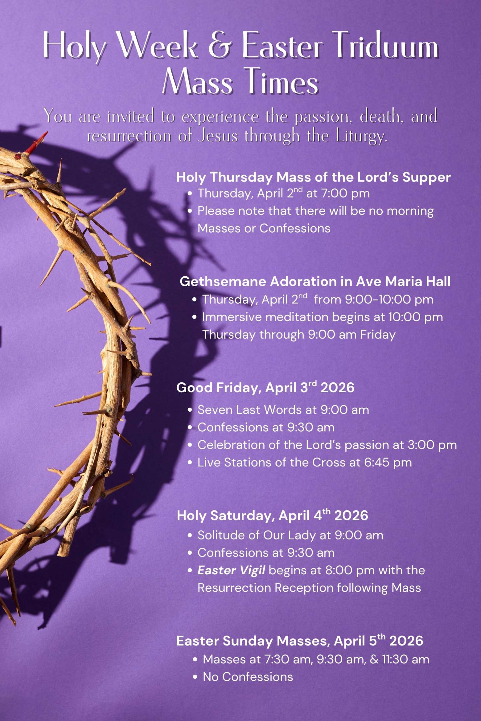 - Confessions before the 9:30am Mass will be delayed until after the start of Mass around 9:45.