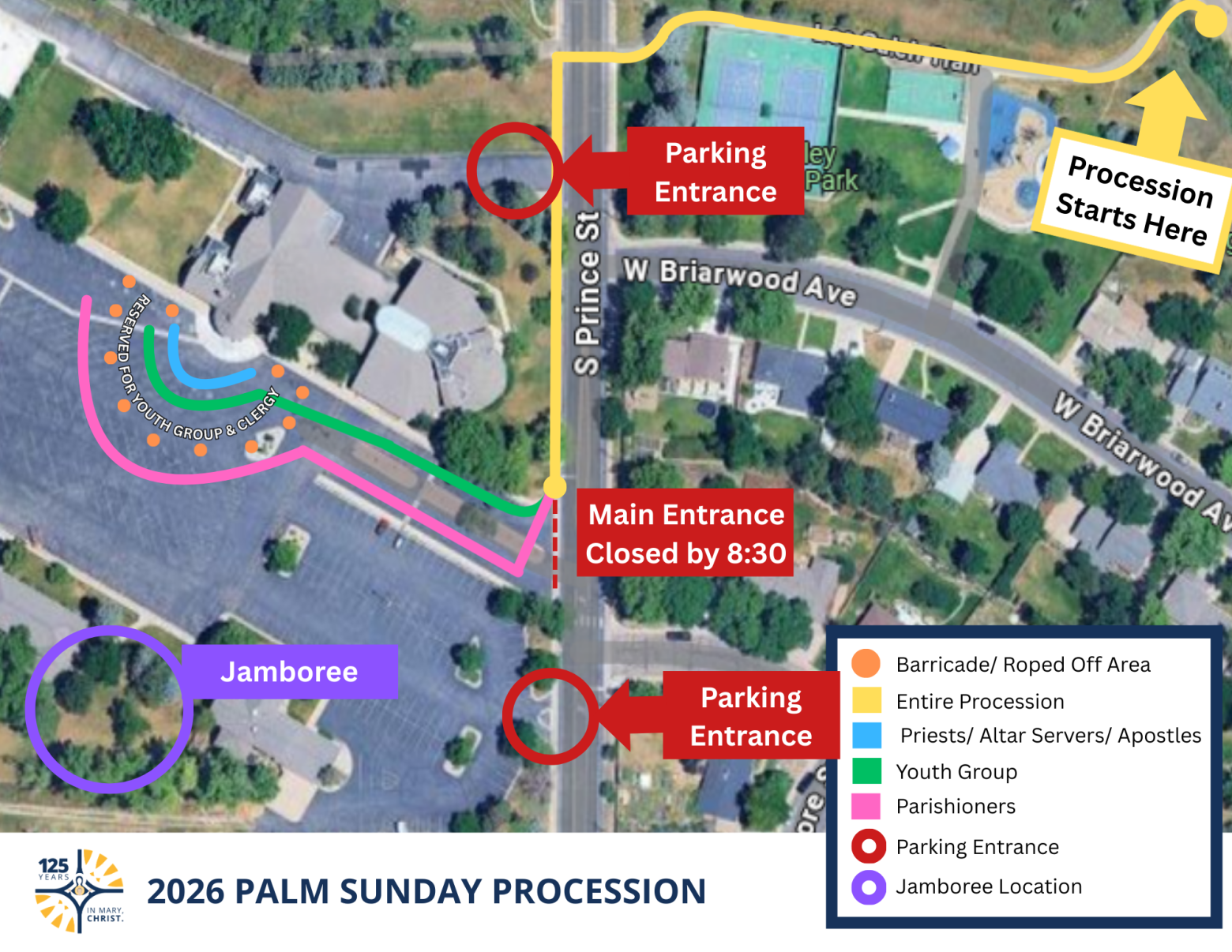 - The Youth Group will lead the procession from the Prince street to the church entrance as indicated by the green line below. Please stay behind the cones to allow them space to dance.