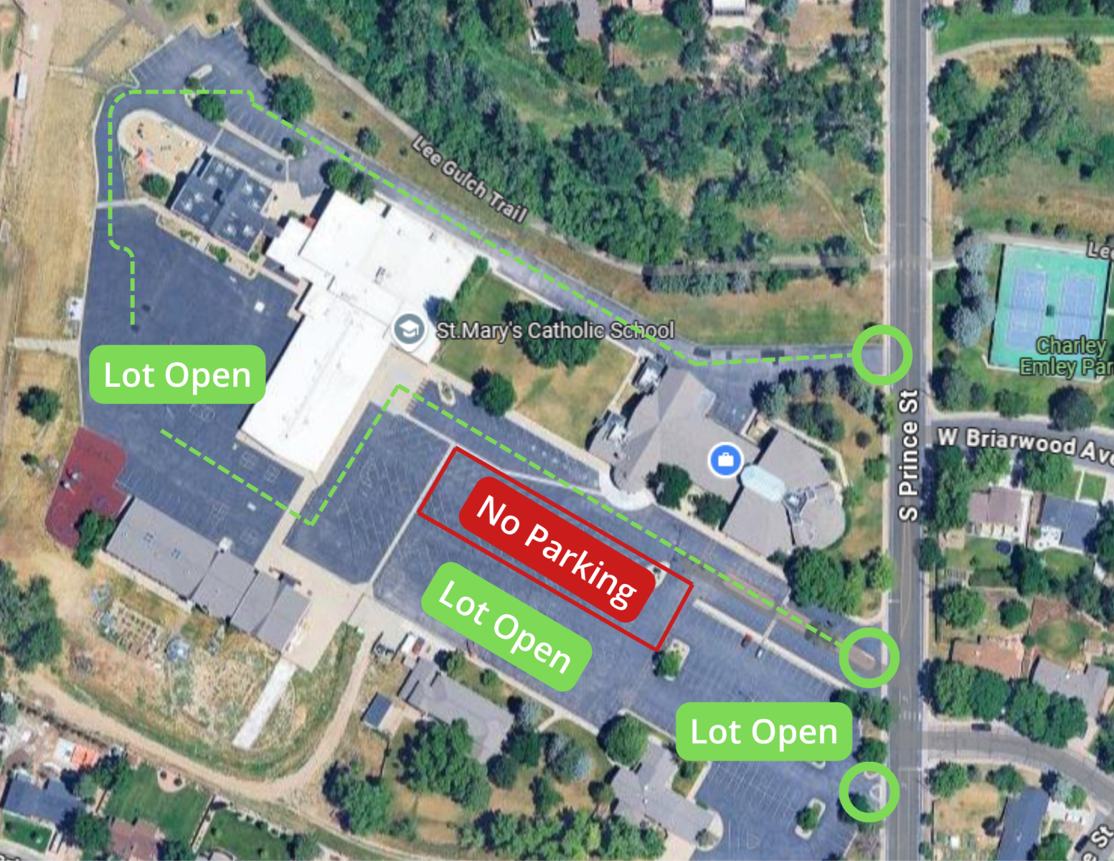 - Plan for parking for 7:30 & 9:30 Masses - The main entrance to the parking lot will be closed to cars by 8:30 am and you will need to use one of the other entrances. Handicap spots will only be available adjacent to the sidewalk between the church and the school.