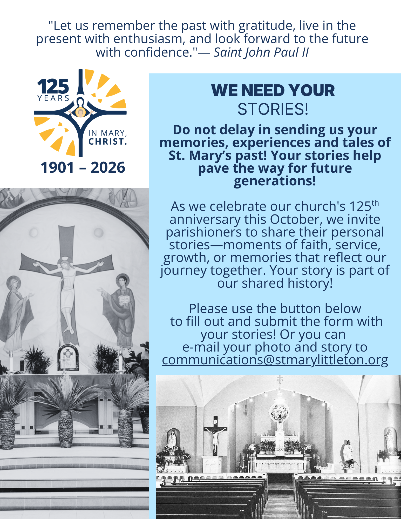 communications@stmarylittleton.org so we can display them in the bulletin! - Leave your palms displayed until the Feast of Pentecost and then bring them to the Pentecost Fire on Saturday, May 23rd.